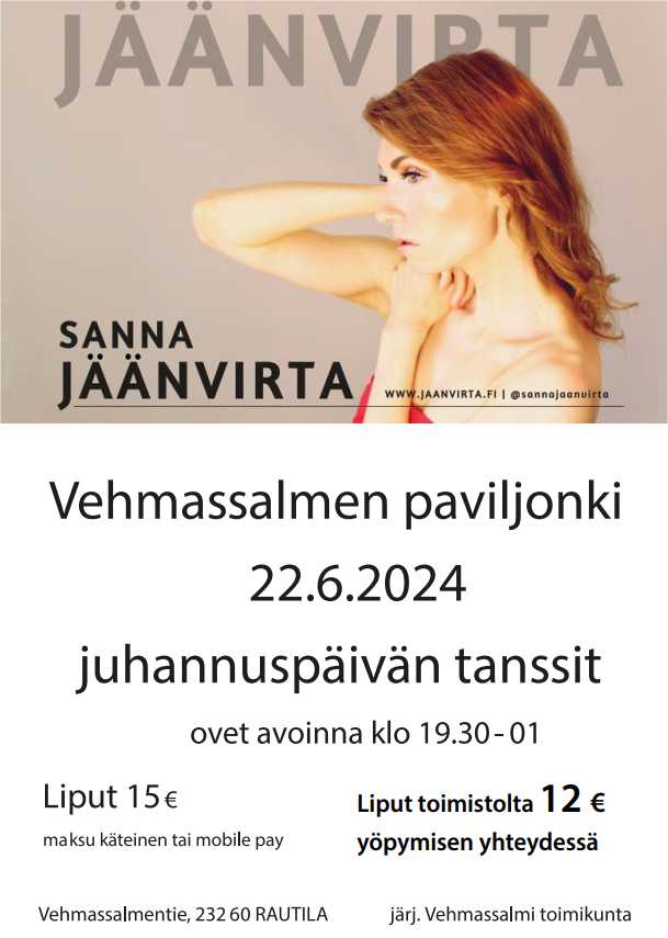 Vehmassalmitoimikunta järjestää juhannustanssit Vehmassalmen paviljongilla 22.6.2024, tanssittajana Sanna Jäänvirta!
